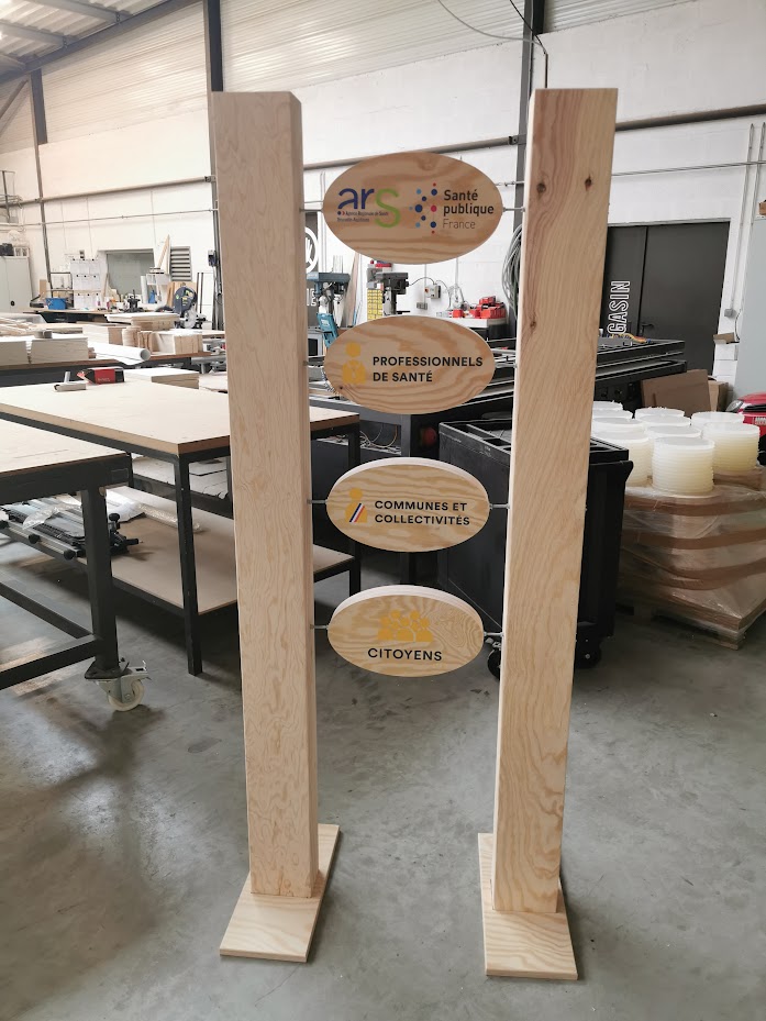 Nous pouvons concevoir des totems réutilisables avec des zones de communication interchangeables (porte-affiches, cadres, recharges adhésives) afin de changer la campagne sans refaire toute la structure.